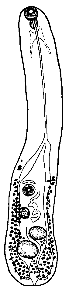 Семяпроводы проходят в vas deferens левее брюшной присоски. Матка короткая, малоизвилистая, содержит от 5 до 20 больших серых яиц размером 0,014—0,019x0,033—0,035 мм. Половое отверстие слева от брюшной присоски.