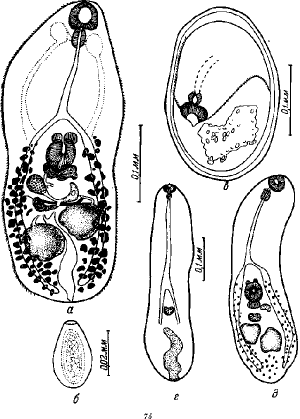 a— марита; б—яйцо; в— метацеркарии в цисте; г, д— метацеркарии, освобожденные от цисты