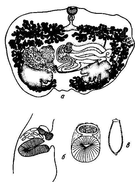 a—общий вид мариты; б—брюшно-половая присоска; в—яйцо