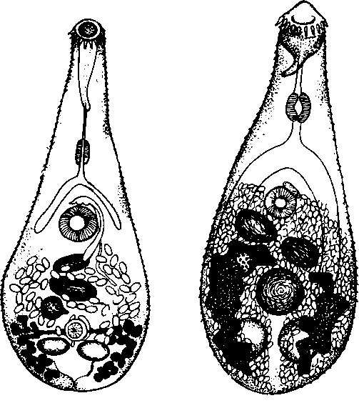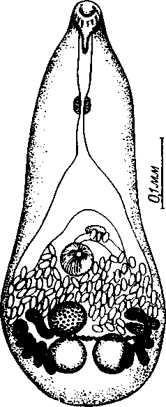 Кишечные ветви тянутся назад до уровня брюшной присоски, и задние концы их скрываются под петлями матки. Брюшная присоска располагается на расстоянии 0,365—0,465 мм от переднего конца тела и достигает 0,045—0,070 мм в диаметре. Впереди от брюшной присоски, налево от медианной линии, в соединении с генитальным синусом, располагается мускулистый гонотиль 0,040—0,045 мм ширины и около 0,016 мм длины. Семенники шаровидные или поперечно-овальные, 0,070—0,120 мм ширины и 0,050—0,100 мм длины. Семяприемник лежит медианно и дорзально впереди семенников.