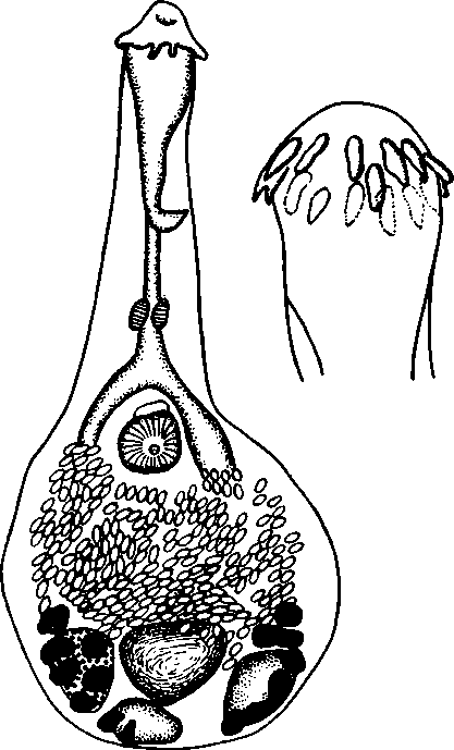 Конический отросток ротовой присоски широкий, в основании сплющенный, суживающийся и обычно закрученный на конце; длина его 0,090—0,140 мм, большей частью простирается на половину или до двух третей расстояния от ротовой присоски до фаринкса. Фаринкс 0,030—0,033 мм ширины и 0,033— 0,038 мм длины. Его передний край лежит на расстоянии 0,120—0,220 мм от переднего конца тела. Пищевод очень короткий. Кишечные ветви не видны позади уровня брюшной присоски; очевидно, они здесь и заканчиваются. Брюшная присоска 0,040—0,05 мм в диаметре, не погружена в генитальный синус и располагается немного позади середины длины тела.
