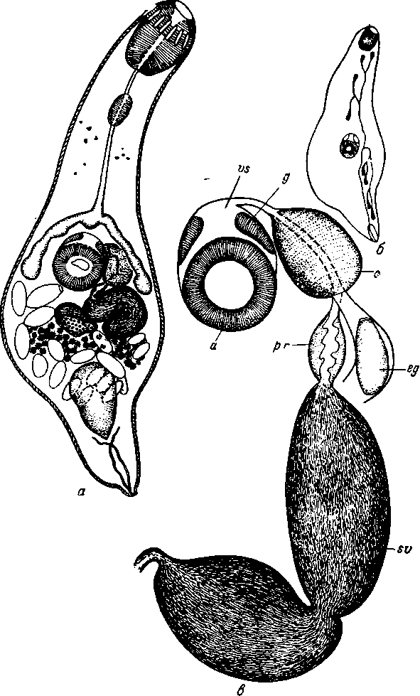 a— общий вид мариты; б— схема экскреторной системы на одной стороне тела; в— схема терминальной части половых органов, vs- вентро-генитальный синус; д— гонотиль; а— брюшная присоска; su— семенной пузырек; pr— простатическая часть; eg—яйцо; с—зкспульсор.