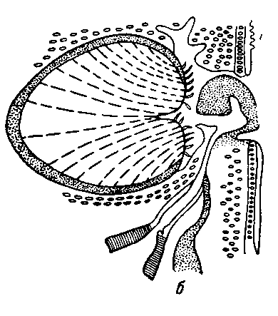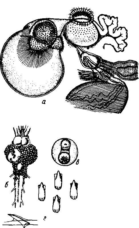 a— выводные протоки половой системы; б— мозг рыбы, покрытый цистами; в—циста; г—форма шипов