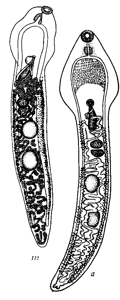 Семяприемник лежит дорзальнее и позади яичника и имеет приблизительно такую же форму и размеры, как и последний. Матка отходит от вентральной части оотипа, извиваясь, идет назад до конца тела, затем, образуя поперечные петли между семенниками и семяприемни, ком и передним семенником, идет вперед и, наконец, сливается с мужским половым протоком и впадает в генитальный синус. Желточники начинаются от уровня переднего края яичника и тянутся по бокам до заднего конца тела. Они состоят из мелких многочисленных фолликулов. Яйца 0,024 мм длины и 0,014 мм ширины.