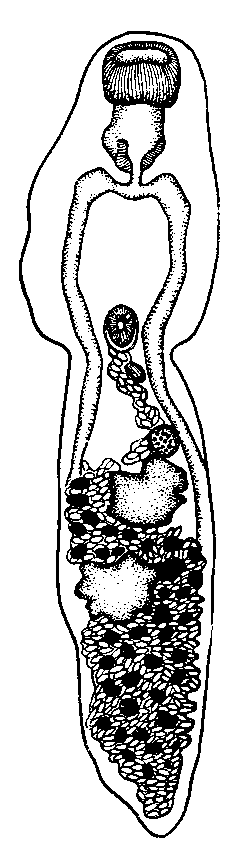 Позади ротовой присоски располагается множество железистых клеток, окружающих префаринкс; за ним лежит мускулистый фаринкс, переходящий в короткий пищевод. Кишечные ветви отходят от пищевода в стороны и немного вперед, затем поворачивают назад и тянутся по бокам, заканчиваясь на расстоянии 0,26 мм от заднего конца тела. Семенники лежат в средней трети задней части тела наискось один за другим; они слегка лопастные и достигают 0,75 мм в диаметре; их семенные протоки идут вперед слева от яичника и сливаются в семенной пузырек, который достигает 0,45 мм длины и 0,15 мм ширины и подразделяется посередине перетяжкой на две части. Яичник шаровидный, расположен на середине расстояния между передним семенником и половым отверстием.