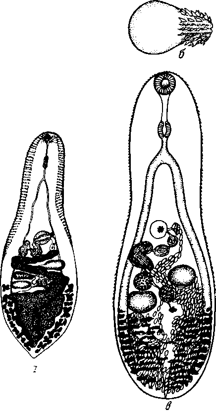 a—общий вид (по Лооссу, 1899); б—гонотиль; в—общий вид (по Витенбергу, 1929)