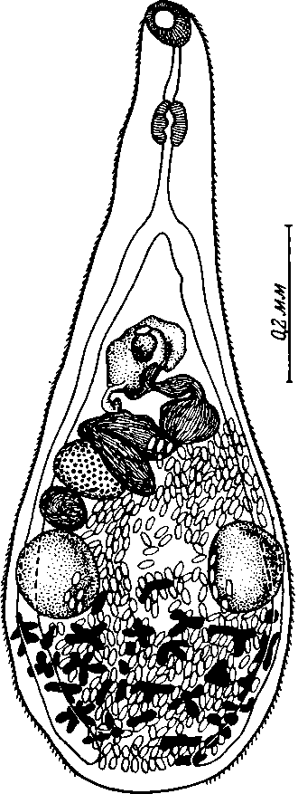 Кишечные ветви тянутся до заднего конца тела. Половая присоска хорошо обозначена, располагается в медианном поле передней половины второй трети тела. Она представляет собою паренхиматозный орган 0,060—0,075 мм в диаметре, внедрена в тело; ее свободный конец открывается в генитальный синус и покрыт простыми, слегка искривленными шипами. В центре свободной поверхности имеется ясно выраженная ямка, вооруженная шипами. Семенники овальные, 0,115 x 0,075—0,156 мм в диаметре, лежат посередине задней трети тела, слегка друг за другом. Семенной пузырек состоит из трех частей; передняя часть его располагается левее медианной линии, средняя — иммедианно и впереди яичника, задняя, удлиненная — наискось впереди и вентральнее яичника.