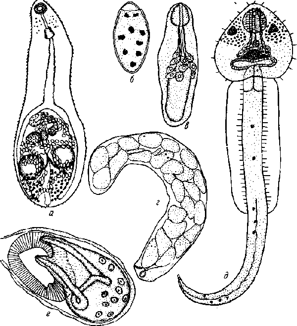 a—марита; 6—яйцо; в—молодая редия; е—зрелая редья с зародышевыми шарами п развивающимися перкариями; д—церкарий; е—брюшно-половая присоска, содержащая брюшную присоску, гонотиль и V-образный уплотненный орган