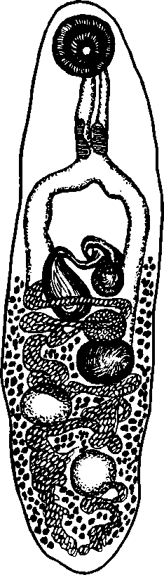 У более зрелых экземпляров желточники в значительной степени редуцированы, и фолликулы их окрашиваются слабо. Матка имеет протяжение от заднего края тела до высоты брюшной присоски. Наибольшая масса ее петель, имеющих как поперечное, так и продольное направление, помещается преимущественно в задней части тела позади семенников, заполняя своими извивами все свободные промежутки между органами. В поперечном направлении петли матки почти достигают боковых краев тела, пересекая кишечные ветви и частью другие внутренние органы тела.