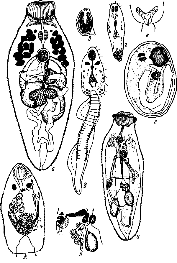 a— марита; б— продольный разрез через генитальный синус; в— яйцо; г— редия; д, е, ж— перкарии: а— метацеркарий в цисте; и— метацеркарий, освобожденный от цисты