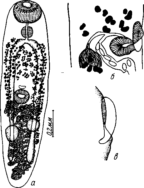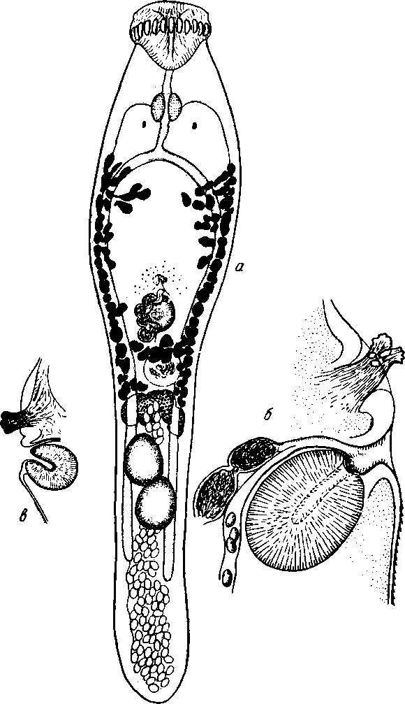 а—общий вид; б—продольный разрез через генитальный синус в—околоротовой шип