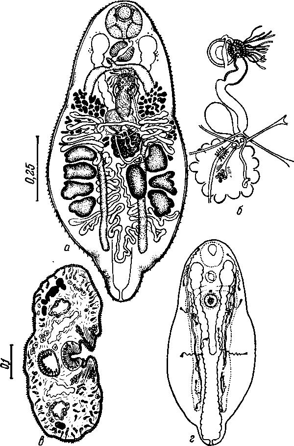 a—общий вид; б—деталь половых органов; в—поперечный разрез в области брюшной присоски и полового отверстия; г — экскреторная система