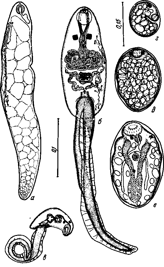 Стадии развития: а — редия; 6 — церкарий; в — церкарий; г, д, в — метацеркарии в цистах