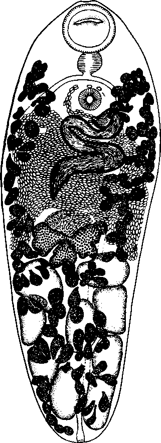 Желточники в виде розеток расположены в латеральных участках, в передней половине тела и во всей задней области, позади яичника. Спереди желточные фолликулы доходят до фаринкса, а сзади простираются до самого конца. Матка занимает всю область тела между яичником и брюшной присоской. Яйца овальные, с крышечками, размером 0,038 X 0,022 мм. Экскреторное отверстие терминальное; экскреторный пузырь не обнаружен.
