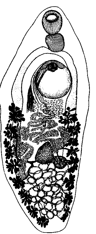Половая и брюшная присоски очень подвижны, и их место расположения подвергнуто значительным вариациям. Вентро-генитальный синус открывается наружу на брюшной стороне маленьким треугольным отверстием, находящимся немного позади бифуркации кишечника. Половая присоска имеет приблизительно треугольную форму и может выступать из синуса. В связи с брюшной и половой присосками находятся мощно развитые ретракторные мышцы. Префаринкс и пищевод имеют очень маленькие размеры и видны только у совершенно вытянутого червя.