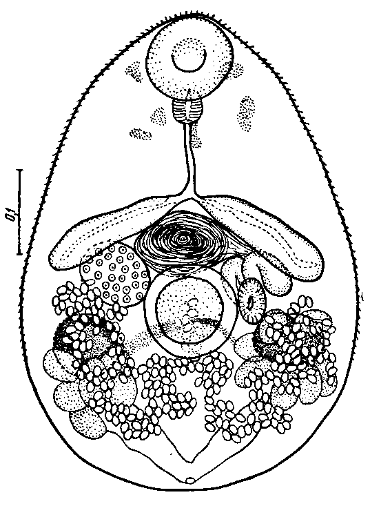 Циррус сосочковидный, вдается в половой синус. Половое отверстие слева от брюшной присоски. Яичник овальный, 0,036—0,054 X 0,048 0,063 мм в диаметре, расположен между правым семенником и правой ветвью кишечника. Тельце Мелиса лежит медианно позади брюшной присоски. Петли матки идут в задней части тела, вентральнее семенников и желточников. Хорошо развитый метратерм открывается в половой синус левее основания цирруса. Яйца эллиптические, светлокоричневые, с толстой оболочкой, содержат эмбрионов, 0,021—0,024 мм длины и 0,012—0,015 мм ширины. Желточники лежат позади семенников, налегают на них и состоят из крупных фолликулов.