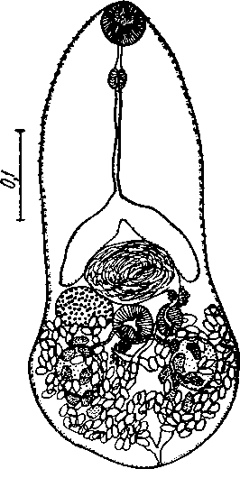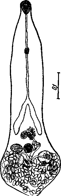 Передний отдел тела тонкий, вдвое длиннее заднего, с минимальной шириной непосредственно позади ротовой присоски. Ротовая присоска терминальная, 0,054—0,080 X 0,042—0,060 мм в диаметре. Префаринкс 0,060—0,150 мм длины. Фаринкс бочонковидный, 0,024—0,033 X 0,020— 0,024 мм. Пищевод 0,16—0,3 мм длины; разветвление пищевода приблизительно в середине тела. Ветви кишечника доходят лишь до уровня семенного пузырька. Брюшная присоска 0,034—0,048 мм в диаметре, лежит в передней половине задней трети тела. Семенники яйцевидные; их размер 0,050-0,070 X 0,054—0,090 мм, лежат непосредственно позади брюшной присоски. Семенной пузырек 0,024 мм в диаметре; простатические железы имеются.