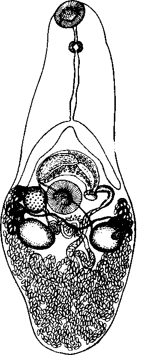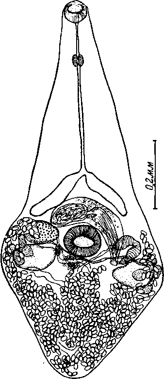 Половая бурса достигает 0,22—0,3 X 0,045— 0,075 мм, состоит из круговых мышечных волокон, изогнутых вокруг брюшной присоски между яичником и половым отверстием. Семенной пузырек удлиненный, простатическая часть короткая, окружена простатическими железами. Семяизвергательный канал снабжен хорошо развитой продольной мускулатурой. Половое отверстие позади и левее брюшной присоски. Яичник поперечно-овальный, 0,050—0,070 X 0,060—0,084 мм в диаметре, расположен между правым семенником и правой ветвью кишечника, левее брюшной присоски. Семяприемник маленький, между брюшной присоской и правым семенником. Лауреров канал открывается на спинной стороне позади брюшной присоски.