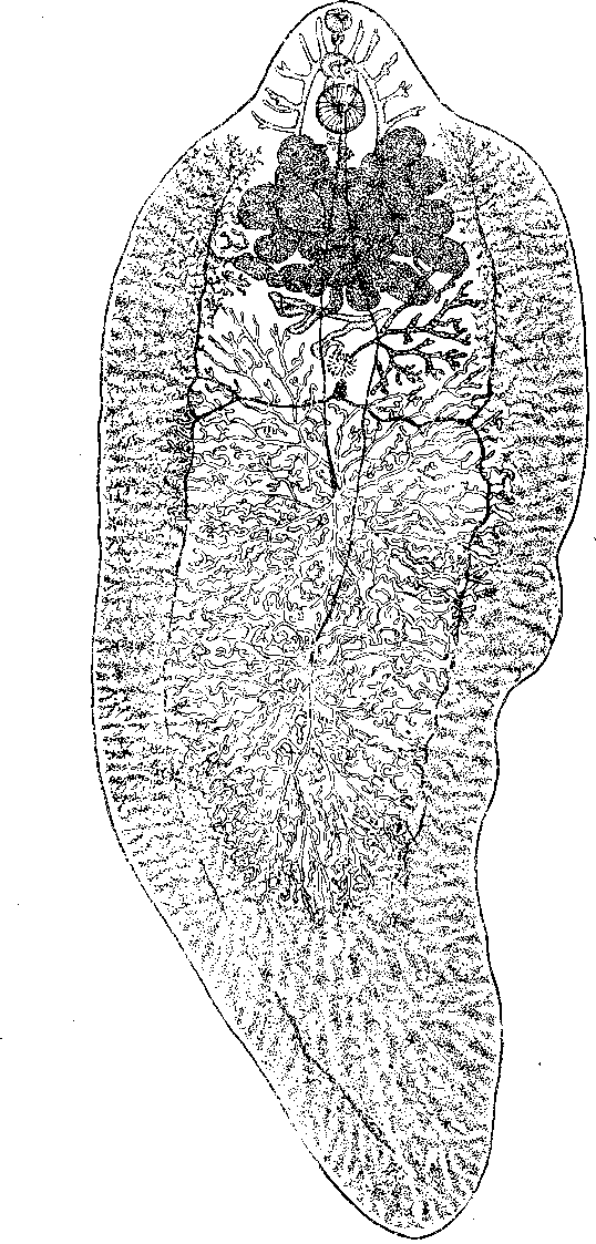 Тело почти круглой формы. Паразиты желчных ходов печени слона - Fasciola jacksoni (Cobbold, 1869).