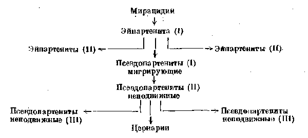 Это поколение можно назвать стационарными, неподвижными псевдопартенитами, поскольку они не двигаются, кроме самых молодых. Они вырастают до величины, значительно превосходящей таковую мигрирующих партенит, и обладают производительностью, во много раз превосходящей таковую материнского организма. Очень интересно то, что анатомия этих вторых поколений полностью соответствует их специфическому образу жизни. Цикл развития партеногенетйческого поколения Fasciola halli Синицын представляет в виде следующей схемы: