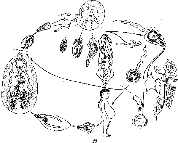 Цикл развития Fasciolopsis buski (no Faust, 1929)