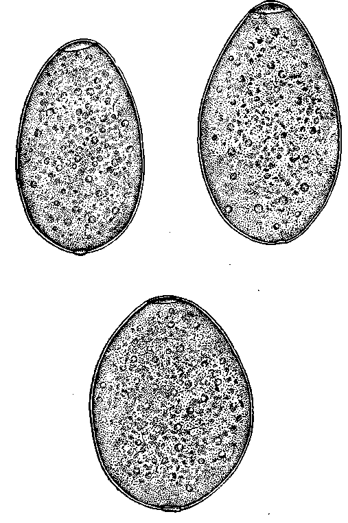 Вариации яиц Fasciolopsis buski (по Скрябину, Подъяпольской и Статировой, 1929)