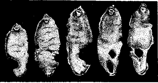 Деформация Fasciolopsis buski после тимоловой дегельминтизации (натур. велич.; по Скрябину, Подъяпольской и Статировой, 1929) в течение двух дней (29 экземпляров в день лечения и 18 — на следующий день); все паразиты были в большей или меньшей степени деформированными.