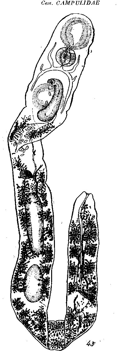 Половая бурса удлиненная, значительно переходит кзаду за уровень брюшной присоски. Циррус мощно вооружен шипами. Семенники овальные, цельнокрайние, располагаются один позади другого в передней или задней трети длины тела. Яичник цельнокрайний, лежит кпереду от семенников; семеприемник отсутствует. Лауреров канал имеется. Желточники состоят из отдельных нежных розеток, составляющихся из фолликулов, соединенных друг с другом радиально расположенными канальцами. Все тело позади семенников заполнено такими розетками желточников. Кпереду желточники либо не доходят до уровня семенников, либо простираются до заднего края половой бурсы. Матка расположена в промежутке между яичником и брюшной присоской, не переходит за края кишечных стволов. Метратерм удлиненный, невооруженный. Яйца треугольные на поперечном разрезе. Полюс, противоположный нахождению крышечки,— утолщен.