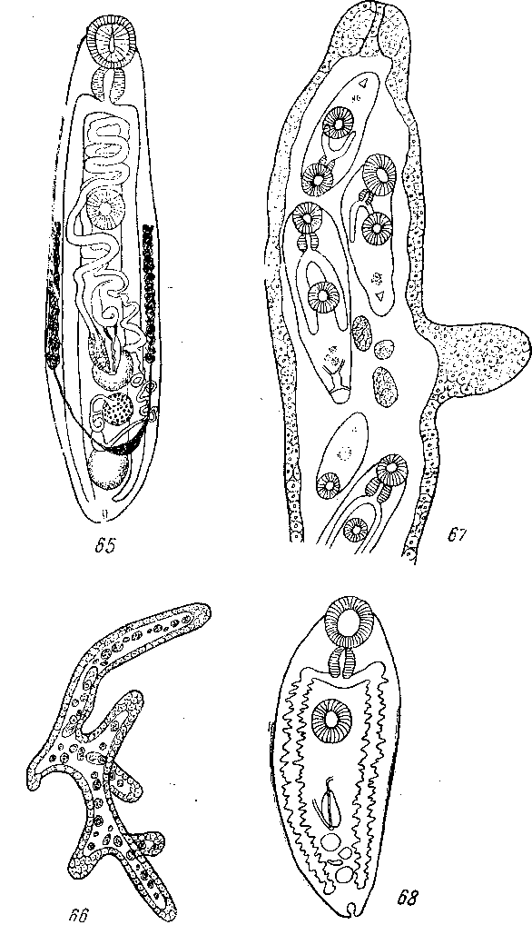 Стадии развития Brachylaemus fuscatus (по Joyeux, Baer et David, 1934): 65 — марита; 66 — изолированная спороциста; 67 — часть спороцисты с церкариями; 68 — метацеркарий, изолированный из почечной железы