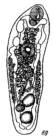 Семенники 0.25 мм, а яичник 0.15 мм в диаметре. Половая бурса 0.18 Х0.07 мм. Желточники начинаются на уровне передней половины брюшной присоски и доходят до переднего края переднего семенника. Матка мощно развита, пересекает кишечные стволы и простирается почти до боковых краев тела, занимая все свободные промежутки, не занятые органами. Яйца 0.032X0.023 мм (по Брауну 0.022—0.032 X 0.014 — 0.018 мм).