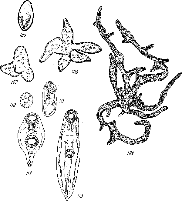 Метацеркарий, извлеченный из околосердечной полости моллюсков, достигает 0.79—0.97X0.27—0.39 мм. Ротовая присоска 0.125—0.175 мм в диаметре, а брюшная 0.080—0.140 мм. Фаринкс 0.067— 0.10X0.067—0.081 мм. Кишечные стволы доходят до задней части тела. Топографию половых желез точно установить еще нельзя. Экскреторный пузырь открывается центральным отверстием, расположенным слегка дорзально от заднего конца тела. Созревшие церкарии покидают тело материнской спороцисты и выделяются из организма во внешнюю среду.