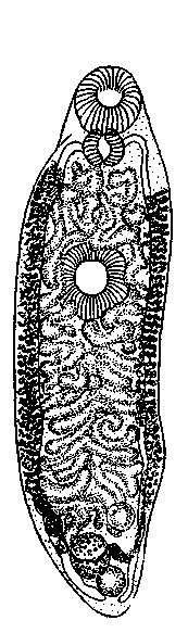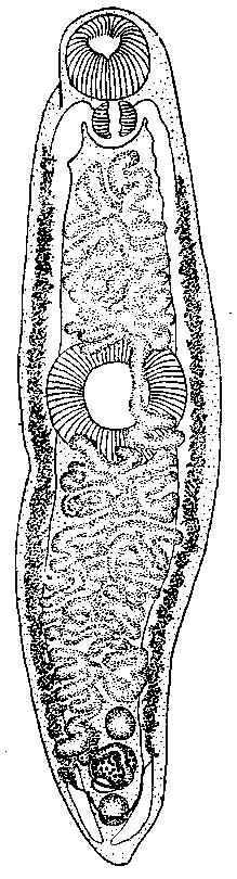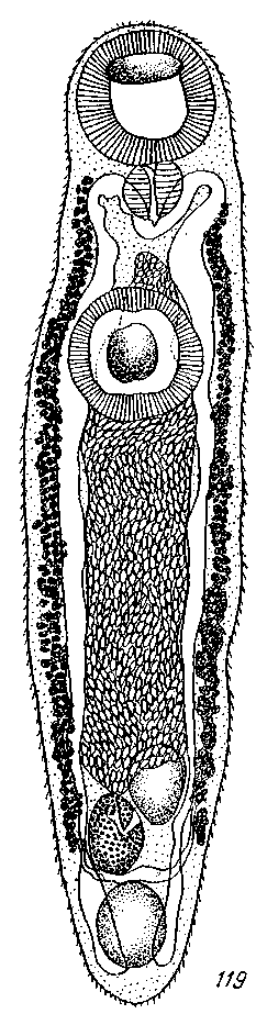 Матка ограничена пространством между кишечными стволами и тянется вперед до брюшной присоски, а назад — до яичника и переднего семенника. Желточники лежат вне кишечных стволов и Тянутся от уровня заднего края брюшной Присоски до уровня яичника; поперечные желточные протоки и желточный резервуар впереди заднего семенника. Яйца многочисленные, с крышечками, желтовато-коричневые, 0.022—0.025X0.0137— 0.0145 мм. Экскреторное отверстие дорзальное, возле заднего конца тела, непосредственно позади заднего семенника.