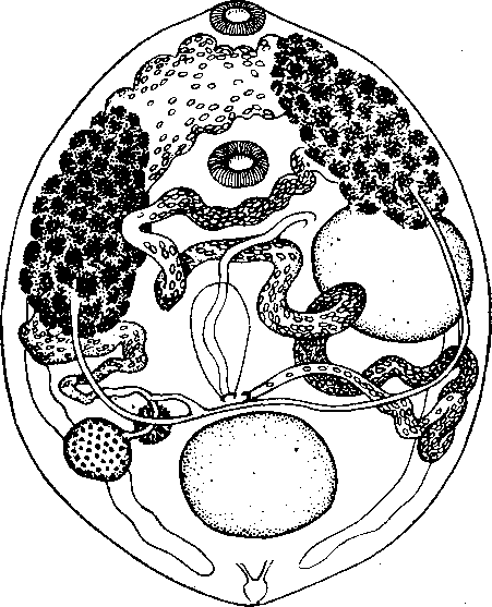 Половое отверстие располагается в задней половине тела, кпереду от переднего края левого семенника, недалеко от латерального края тела. Яичник на стороне, противоположной расположению полового отверстия, крупный, цельнокрайный, кпереду от правого семенника. Желточники — от развилка кишечника до уровня яичника. Матка из густо сплетенных петель занимает пространство между уровнем брюшной присоски и половыми железами. Яйца распределяются по цвету на три группы: восходящее колено матки наполнено светлоокрашенными яйцами; после этого матка поворачивается, образуя нисходящее колено, в котором лежат яйца желтого цвета; конечные петли нисходящего колена матки содержат темнобурые яйца, содержащие мирацидиев.