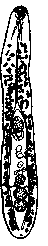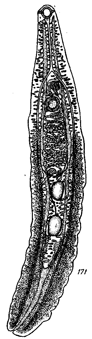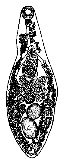 Два поперечных желточных протока вздуты у медиальных концов и соединяются слева от средней линии, сзади яичника, где они соединяются с яйцеводом, маткой и лауреровым каналом. Этот последний тянется извилистым ходом к дорзальной стенке тела, с которой он соединяется слева от медианной линии и дорзально от тельца Мелиса. Матка проходит сначала сзади тельца Мелиса, затем поворачивает вперед, образуя ряд поперечных петель между яичником и брюшной присоской, ограниченных с двух сторон экскреторными стволами. Передняя часть ее образует длинный и узкий метратерм, проходящих по левой стороне брюшной присоски к половому отверстию. Размер яиц 0.0625 X 0.0375 мм.