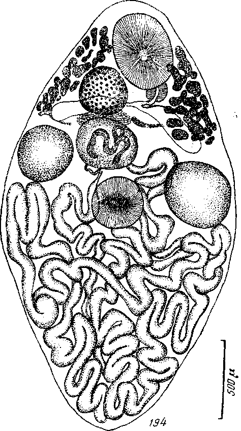 Семенники — от круглой до овальной формы, 0.32—0.37 ммх0.40— 0.42 мм, расположены симметрично по сторонам тела, на границе передней трети и занимают несколько поперечное положение. Они лежат непосредственно позади концов кишечных стволов и у передних петель матки. От их переднего края идут vasa efferentia, которые направляются к центру, чтобы встретить в передней части брюшной присоски образующийся семепровод. Последний идет от правой стороны брюшной присоски и скоро расширяется в семенной пузырек, свертывается в передней части брюшной присоски и проходит незаметно в ductus ejaculatorius, открывающийся в половой атриум при помощи небольшого отверстия. Лишенный шипов, половой атриум сообщается с наружным половым отверстием впереди брюшной присоски и между кишечными разветвлениями, немного левее от средней линии. Канал, открывающийся в ductus ejaculatorius, окружен простатическими железами, которые занимают пространство 0.23 х0.023 мм, окружая половое отверстие.
