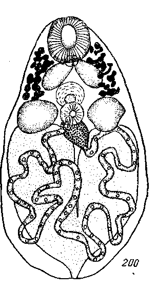 Семенники, 0.07—0.08 х0.0б—0.07 мм, круглой или яйцевидной формы, лежат симметрично с каждой стороны брюшной присоски; от их внутреннего края поднимаются vasa efferentia, соединяющиеся в центре, на спинной стороне брюшной присоски в семепровод. Расширяясь, семепровод образует семенной пузырек, который переходит в ductus ejaculatorius. Половое отверстие, через которое ducsus ejaculatorius открывается наружу расположено непосредственно впереди брюшной присоски. Большая простатическая железа, 0.06 мм в диаметре, лежит отчасти впереди, отчасти загибается вокруг брюшной присоски.
