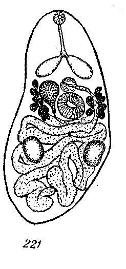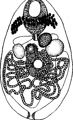 Впереди сделана выемка шаровидным семеприемником и гладким penis, который достигает 0.13 мм величины. Семенной пузырек продолговатый, прилегает к присоске сзади и наполнен сперматозоидами. Два яйцевидных семенника располагаются позади брюшной присоски. Яичник лежит сбоку, впереди семенников; яйцевод изогнут несколько раз, и гребневидный край отверстия расположен на боку семеприемника. Яйца продолговатые, 0.019—0.021x0.008 мм.