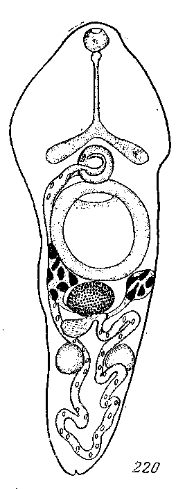 Экскреторная система в задней части тела делится на две короткие ветви.