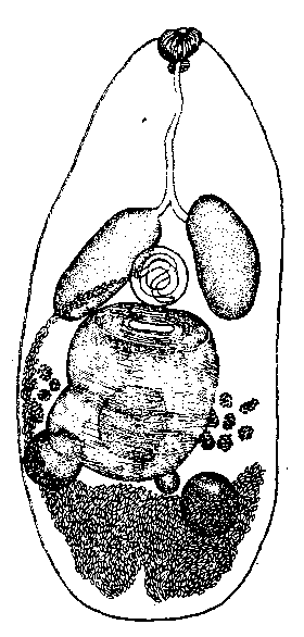Половое отверстие примыкает к переднему краю брюшной присоски. Позади брюшной присоски, симметрично по бокам тела расположены округлой формы семенники, имеющие в поперечнике 0.065—0.085 мм; один из них несколько выступает вперед. Кпереди от семенников, на уровне брюшной присоски, лежит слегка сплюснутый с боков яичник, 0.102 X 0.085 мм; иногда он несколько сдвинут вправо. Желточники, в виде небольших фолликулов (0.042 х0.048 мм) в количестве 7—8, собраны розетками и лежат по бокам яичника. Петли матки, занимая заднюю часть, прикрывают частично или полностью семенники и заполнены продолговатыми яйцами 0.018 х0.009 мм.