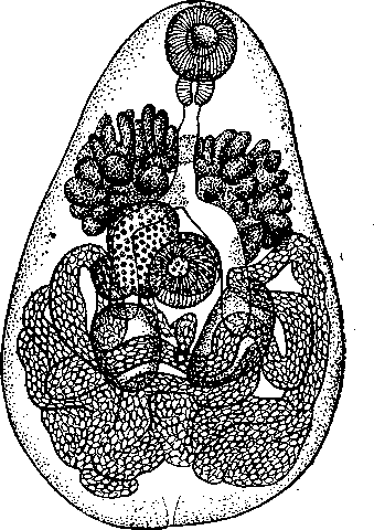 Яичник состоит из 3—4 лопастей, диаметр наибольшей лопасти приблизительно равен диаметру брюшной присоски. Яйцепровод отходит от заднего края яичника; семеприемник и лауреров канал имеются. Желточники состоят из широких лент фолликулов, окружающих пищевод. Матка состоит главным образом из поперечных петель, заполняющих заднюю половину тела; передние петли оканчиваются коротким мускульным метратермом. Яйца 0.027 х 0.020 мм, оканчиваются на базальном конце коротким шиповидным отростком.