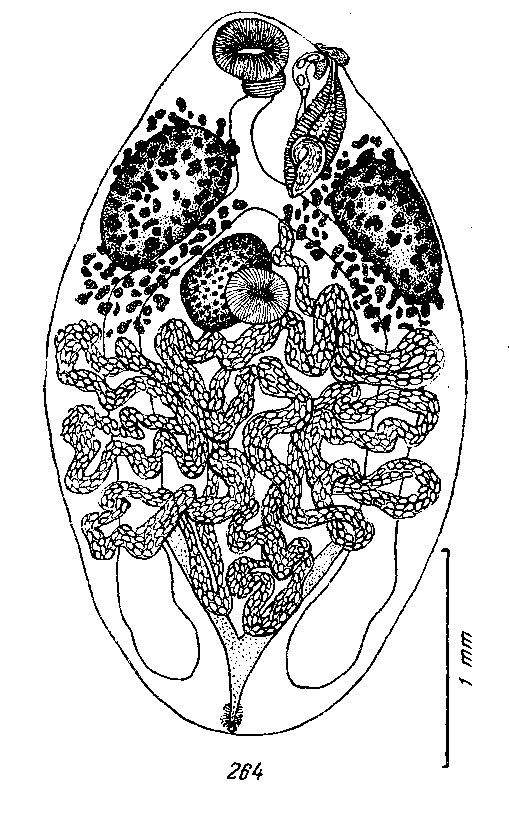 Шипы на переднем конце тела густо собраны, а позади брюшной присоски их меньше; они не выступают над поверхностью тела. Живые половозрелые паразиты были 2.4—4.1 мм. длины и 1.3—2.8 мм максимальной ширины в области немного позади брюшной присоски. Размеры фиксированных экземпляров варьировали от 2.6—4.1 мм в длину и 1.4—-2.9 мм в ширину. Размер паразитов зависел от количества трематод, заключенных в цисте; чем меньше паразитов было в цисте, тем больше был их размер.