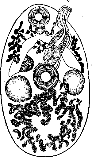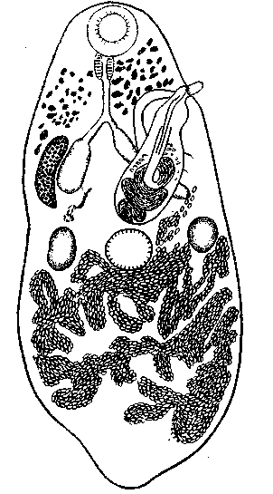 Левый семенник, 0.1—0.23 X 0.08—0.1 мм, отодвигается несколько хвостовой частью хорошо развитой половой бурсы, которая лежит впереди и отделена от семенника и брюшной присоски проходящими петлями матки. Vasa efferentia отходят в виде нежных трубок от заднего внутреннего конца каждого семенника и проходят более или менее поперечно впереди брюшной присоски, чтобы войти в семенной пузырек через маленький и незаметный vas deferens.