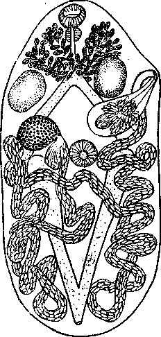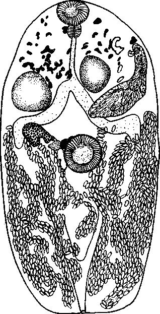 Желточные протоки идут косо и встречаются, образуя маленький треугольной формы желточный резервуар, который лежит с правой стороны передней половины брюшной присоски.
