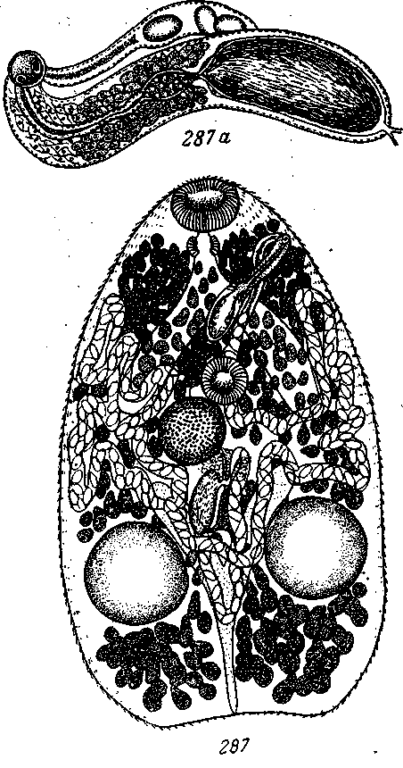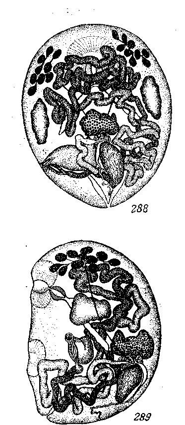 Между обеими присосками находится весь половой аппарат, тогда как обыкновенно перед брюшной присоской лежит только половое отверстие, здесь же помещаются также половые железы, тельце Мелиса и семенной пузырек. Яичник лежит довольно близко к задней стенке тела, на высоте кишечных стволов, сильно извитой яйцевод тянется от яичника вниз и проходит петлями матки через все тело. Маленькие желточники лежат в стороне, перед ротовой присоской; желточные ходы проходят почти по всей длине тела; только над брюшной присоской они сходятся в непарный желточный ход, который соединяется здесь с маткой.