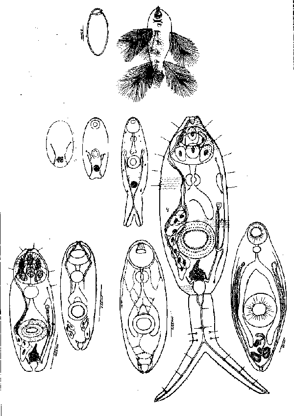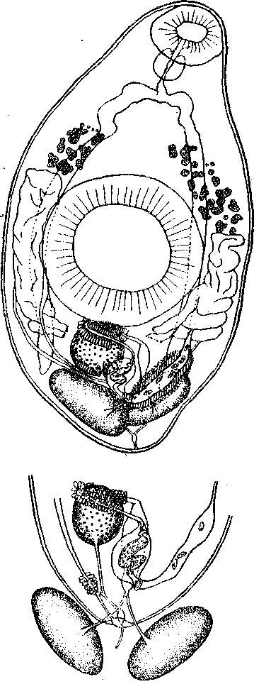 7. Одиннадцать пар желез, содействующих внедрению церкариев, расположены тремя группами в ротовой присоске, из которых для трех пар не было найдено протоков. Вокруг брюшной присоски расположены две группы желез: одна из пяти, а вторая из трех пар.