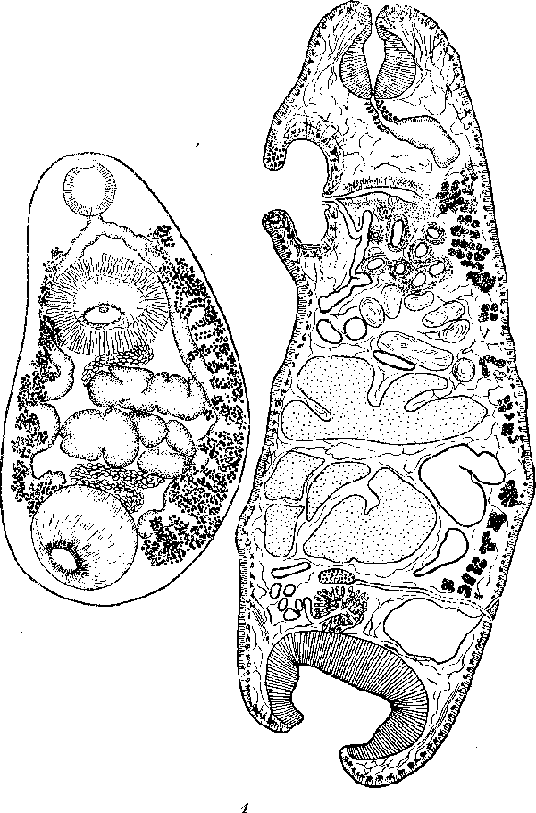 Почти круглый яичник, достигающий 0.8—1.0 мм в диаметре, лежит между задним семенником и присоской, очень близко к вентральной поверхности; он настолько отклонился от медианной линии, что его латеральный край отстоит приблизительно только на 0.3 мм от края тела и отделяется от него лишь желточниками.