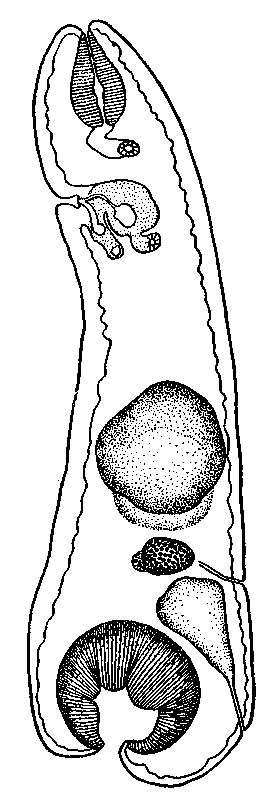 Задний конец всегда бывает усечен, а вентральная присоска открывается совершенно терминально. Дорзо-вентральный диаметр задней присоски 0.70—0.87 мм, максимальная толщина ее стенки 0.3 мм, а ширина отверстия 0.15 мм. Кутикула гладкая; рот окружен пальцевидными сосочками; субкутикула вентральной поверхности пигментирована и заметно утолщена (0.01 мм), а покрывающая ее кутикула собрана в неправильные поперечные складки.
