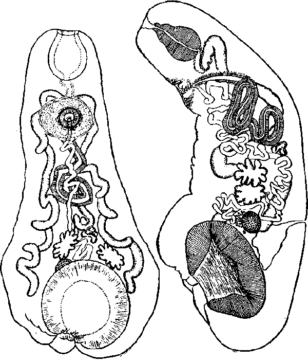 Сравнительно мощно развитая ротовая присоска в вытянутом состоянии имеет кругловато-овальную форму (1.5—2x1—1.5 мм), а во втянутом — спереди сильно сужена и представляется грушевидной. Пищевод, длиной около 1 мм, сильно изогнут S-образно; близ дорзальной поверхности, впереди полового отверстия, он подразделяется на два кишечных ствола, расходящихся вначале в поперечном, или даже несколько переднем, направлении, после чего они поворачивают почти под прямым углом к заднему концу и тянутся, сильно извиваясь, на расстоянии 0.6 —0.8 мм от латеральных краев тела, до основания присоски; здесь их слепые концы поворачивают в дорзальную сторону. Просвет кишечных стволов достигает в ширину 0.3—0.5 мм.