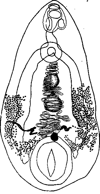 Яичник в задней половине тела, несколько впереди брюшной присоски. Желточники располагаются узкими полосами, как кнаружи от кишечных стволов, так и налегая на последние; простираются от Задних краев семенников до задней присоски. Медианная зона в промежутке между семенниками и задней присоской заполнена петлями матки. Матка вначале поднимается по направлению к семенникам, придерживаясь дорзальной стороны тела, потом она спускается кзаду, прилегая к вентральной поверхности, и, наконец, снова направляется кпереду, к половому отверстию. Лимфатическая система состоит из 3 пар продольных стволов.