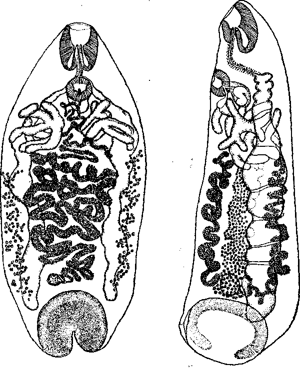 Желточники расположены в виде двух полос, по одной с каждой стороны, длиною 8 мм, при ширине 1.5 мм; они тянутся вентрально и несколько латерально от кишечных стволов в промежутке между брюшной присоской и семенниками.